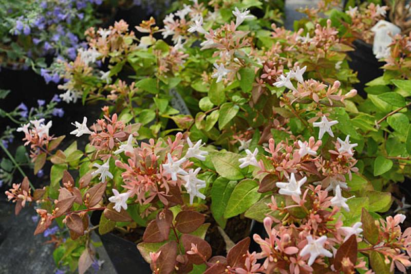 Abelia ‘Kaleidoscope’ is reported to be the longest-blooming of all the abelias. By late spring the entire bush is covered with soft pink buds that open to white blooms. The blooms keep coming well into autumn.