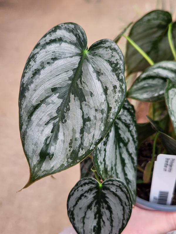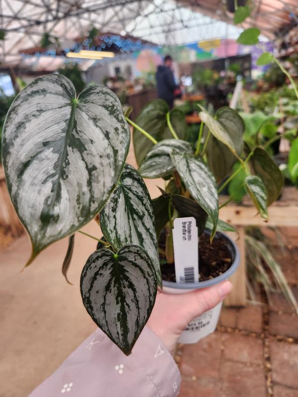 Philodendron brandtianum is a vining plant with heart-shaped leaves that boast a unique silver or white variegation pattern. The leaves are a deep green with silvery markings that resemble brushstrokes, giving the plant a shimmering appearance. This Philodendron is a popular choice for hanging baskets or climbing up a moss pole.