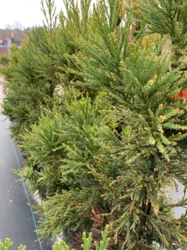 Cryptomeria japonica 'Radicans' is a robust, fast-growing selection of Japanese cedar with columnar to pyramidal growth habit. It has dense, blue-green, feathery foliage that retains its color in winter with less bronzing than other Japanese cedars. After 10 years, ‘Radicans’ grows to heights of 30 to 40 feet (10-12 m) tall (sometimes up to 50 feet/15m) and 15 to 20 feet (5 - 6 m) wide. It is less prone to tip blight and leaf spot than other members of the species.